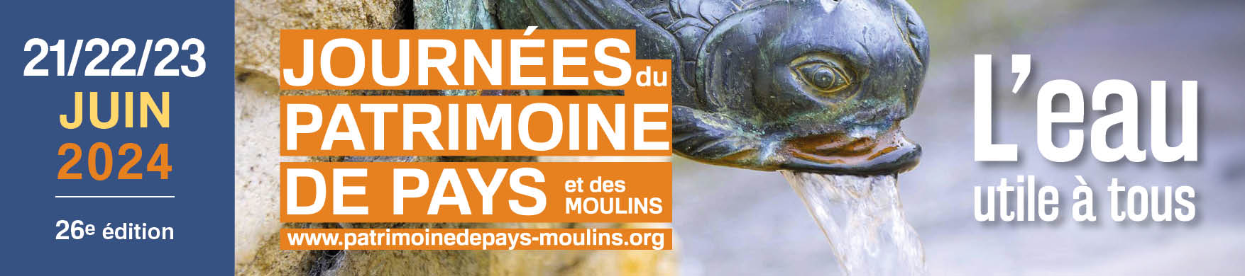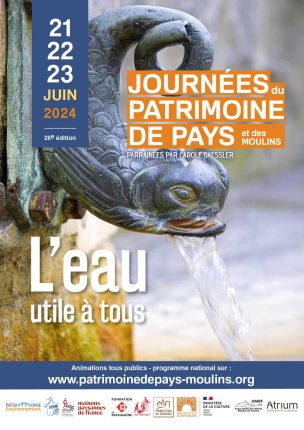 Les Journées du Patrimoine de Pays et des Moulins (JPPM) auront cette année pour thème « l’eau, utile à tous ». 70% de la surface de notre globe, c’est donc évidemment un thème très riche tant dans les nombreux savoir-faire qu’il recouvrent (meunerie, pêche, alimentation,…) que dans ses apparitions à l’état brut (rivières, étangs, marais,…). Et bien sûr, par le foisonnant patrimoine bâti pour en tirer de la valeur ou pour la préserver.